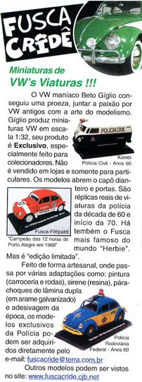 Fusca Cridê, teve o prazer de fazer parte da Revista para Colecionadores de veículos antigos "A BIELA". Uma revista dedicada aos amantes do antigomobilismo. É vendida somente por assinatura, e é claro para todo o Brasil. Se você gostou, e quer assinar, envie um e-mail para abiela@terra.com.br aos cuidados de Tiago Songa. A REVISTA É NOTA 10!!! |